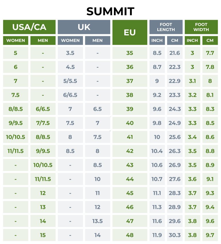 | Mujer EE. UU./Canadá | Hombre EE. UU./Canadá | Mujer Reino Unido (RU) | Hombre Reino Unido (RU) | UE (Unión Europea) | Longitud del pie (pulgadas) | Longitud del pie (cm) | Ancho del pie (pulgadas) | Ancho del pie (cm) |