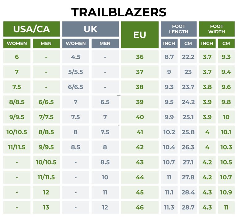 | Mujer EE. UU./Canadá | Hombre EE. UU./Canadá | Mujer Reino Unido (RU) | Hombre Reino Unido (RU) | UE (Unión Europea) | Longitud del pie (pulgadas) | Longitud del pie (cm) | Ancho del pie (pulgadas) | Ancho del pie (cm) |